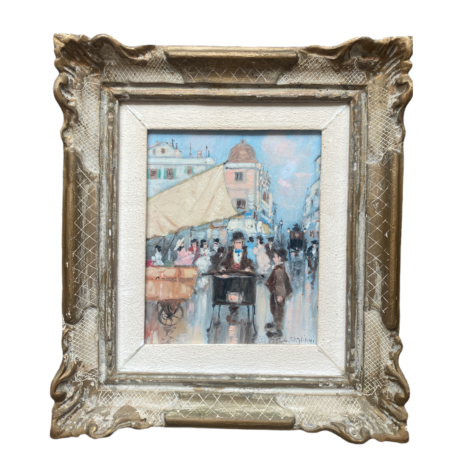 Luigi Cagliani is an artist from the 20th century. He was an Impressionist artist who worked in Italy and France. Cagliani most commonly painted lakeside scenes and scenes set in Venice. The colors in his paintings are gracefully chosen, leaving the viewer with a calming feeling as they gaze upon Cagliani's subjects leisurely going about their day.